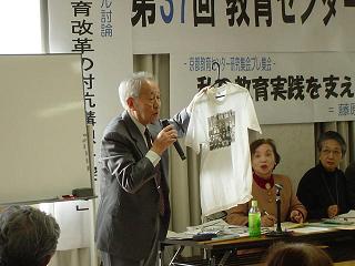 草の根からの取り組みの一歩を、勇気と確信をもって踏みだそう! −−−中須賀ツギ子(京都教育センター) 「タイムカプセル」が 語りかけてくれたこと 去る一月七日(成人式の前日)、久しぶりに最終勤務校(石田小学校)を訪れる。卒業生達との約束(二十歳になったら、タイムカプセルを開けよう)を果たすためである。降りしきる雪の中、スコップを手にした若者・教師・保護者代表の共同作業で、固い土くれとの格闘の末、白い容器が姿を現す。再会した者同士の会話が消え、拍手と歓声に包まれて、タイムカプセルが掘り出される。八年前の卒業式の数日前に、みんなで土をかぶせ終わった時の感動の場面がよみがえって、その暖かい空気に寒さも和らいだかのような気持ちを味わった。 校庭からふれ合いルームに場所を移して、取り出したばかりの個々人のビニール袋の中身を確かめ、八年前の自分と対面し、友達と交流し合う姿は、実に生き生きとして嬉しそうである。担任を囲んで、あるいは学級の枠を超えて、共に過ごした学校生活の思い出を語りあう姿に、子どもたちが輝く学校づくりを目指して粘り強く取り組んだ教職員仲間、暖かく支援して下さった保護者、PTA、地域の方々の姿が重なり合う。私が担任した障害のある子どもたちは勿論のこと、様々な課題を抱えている子の育ちの背景を探り、わかる授業づくり、学級づくりの交流、学校の中に優れた文化の取り組みをと、手間暇かけての「手漉(す)き和紙の卒業証書」づくり、たて割集団での全校遠足や、児童会が主役の遊び集会、広島への修学旅行に持参する全校児童の折り鶴、PTAと共催の子どもまつり、卒業生全員で演奏する「石田太鼓」。数え上げればきりがないほどの素晴らしい体験を積み重ね、共に育ち合った子ども達だからこそ、「タイムカプセル」への思い入れも強く、今後、彼等が社会人として生きていく上でも心の支えとなってくれるだろうとの思いを強くし、誇らしかった。 教育再生会議の「第一次答申」を読んで 子ども不在の矛盾だらけのその中身は、改悪教育基本法の具体化そのものであり、教育の本質をゆがめ、戦争する国づくりの為の方針であることに、大きな怒りと危惧の念を抱かずには居られない。 全国一斉学力テストの実施、習熟度別授業の徹底で競争と格差が一層強まり、ストレスをためて不登校や引きこもりの子どもが増えるのではないかと考えるのは、早計だろうか。さらに授業時数の十%増加の提案は、あまりにも学校現場の問題を無視したもので、子どもの心に寄り添った教育、学級づくりに心を砕いている教師への許し難い攻撃だと思う。集団で取り組む文化の創造や、思いやりや、達成の喜びを味わえる行事等が減らされたら、学校は、子どもたちにとって楽しく学び、育ち合う場でなくなり、不毛の地となりかねないだろう。 教育は、学校は未来に生きる子ども達のもの。子ども達の輝く未来を切り開くために、憲法をよりどころに、私たちは勇気ある一歩を踏み出さなければと、心から訴える次第である。 |