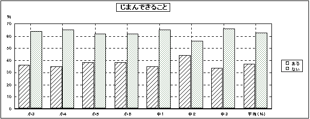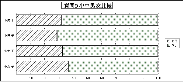 全体の6割〜7割の子どもが「がんばれていない」と答えており、自分に自信が持てていないことが伺われる。この点は、前記(質問8)の調査結果と同じ様な傾向を示している。しかし、同時に1/3近くの子どもが「ある」と答えているのは、(学校等の)取り組みいかんでは、子どもたちに「ぼく(わたし)はえらいなあ。がんばってるなあ。」という思いを持たせることも可能ではないかと思う。