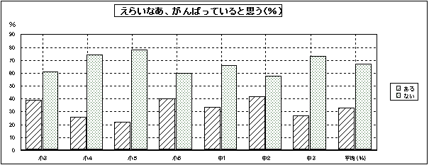 ![]() (質問番号9)「あなたは「ぼく(わたし)はえらいなあ。がんばってるなあ。」と思うことがありますか。」の結果は、次の通りである。