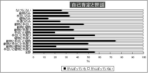 そこに至るには、何が重要になってくるのか?その点で示唆にとむのは、質問番号3と9との関係である。質問番号3の「動物の世話」「手伝い」「植物の世話」「外遊び」の中で、特に、「手伝い」(労働)を経験している子どもほど、「自分はがんばっている」と認識している子どもが多いという点である。しかも、「動植物への世話」「手伝い」が重複している子どもほど、その傾向が強いことが伺われる。