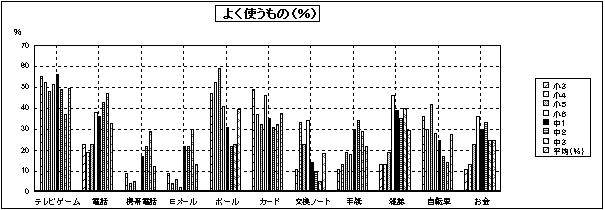 「携帯電話」に関しては、小学校では一部の利用が見られるが、全体としては少数で、中学生になって増加していくものと思われる。(しかし、調査後の2000年〜2002年にかけて、小学校高学年の女子の間で、クラスによっては50%に達するなど、急速に普及していることが報告されている。)