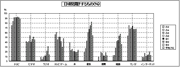 ![]() 子どもたちの情報の入手手段としての第1位は テレビ、第二位は マンガ、第三位はテレビゲームである。全体として高学年になるに従って、流行的青少年文化を流布する傾向を持つメディア