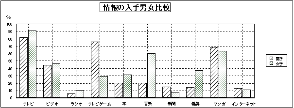 この情報の入手について、男女別に比較してみると、男子では「テレビゲーム「マンガ」などが多いのに対して、女子では「雑誌」「音楽」などが圧倒的に多いことがわかる。小学校の高学年では、比較的に女子の精神的発達が早く、流行的な青少年文化への関心が、男子よりも早い段階で高まると考えられる。また、男女とも「本」「新聞」などの率が低いことから、「活字離れ」が生活の中で起こっていると思われる。「雑誌」は、「読む」というよりも「見る」ということに重点が置かれているのであろう。