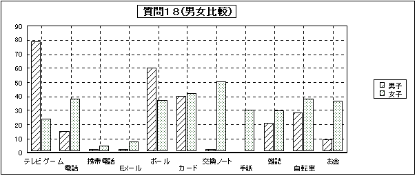 ![]() ![]() 質問番号18の男女別比較では、下記のようになる。この設問に関する回答は、質問番号17と同様に男女差が著しいのが一つの特徴である。 遊びに関する点では、男子は「テレビゲーム」「ボール」が高く、「カード」「自転車」には大きな差が見られない。女子は「お金」が数値として高い。(「ショッピング」が推測される。)