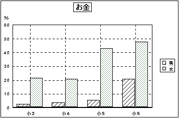 ![]() また特に注目すべき点は、「お金」の問題である。この点について泉真理子は次のように指摘する。「「お金でおかしやおもちゃを買う」と答えた女子の学年別推移と、男子の学年別推移を比べると、ちょうど1年のずれで、女子の推移経過を男子がたどっていることがわかる。