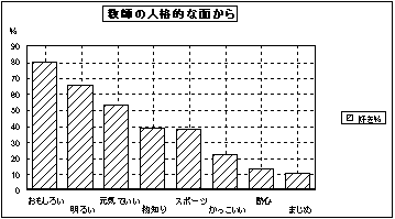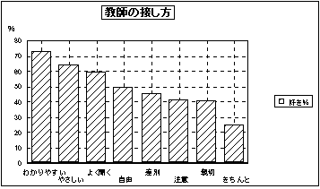 ![]() 今回の調査では、人格に関する項目・指導に関する項目に分けて検討してみると、人間性に関する項目では、「おもしろい」「明るい」「元気でいい」などの項目が高い値を示し、反面「まじめ」「熱心」などの項目は低い値を示している。また、指導性の面では、「わかりやすい」「やさしい」「よく話を聞いてくれる」などが高い値を示している。これは、児童が不文に対して、「ていねいな」対応を求めている現れであろうと思われる。反面「きちんとさせる教師」「注意の多い教師」には、あまり好意を示していないことが分かる。 ![]() (2)調査項目から見られる特徴