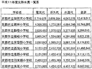 わたしたちは、1999年度(指定研究3年目で総括的な研究発表会がおこなわれた年度)における光熱水費について、御所南小学校と同規模(20学級)の小学校9校のものを教育委員会から情報提供を受けました(資料1)。