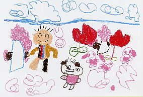 | 四月、憧れのぞう(年長)組になった子どもたち。春の最初のこの時間にしか楽しめない桜満開の植物園へ全員そろって出かけました。そして、次の日に、「きのう しょくぶつえん いったやろ、さくらと ちゅーりっぷとが すごかったなあ。さくらのはなびらが おちてきて ぱっととるねん。でもむづかしいねん。おもしろかったあ」と、お話しながら描いてくれました。 (さつき保育園・五歳児クラス/京都市) |
