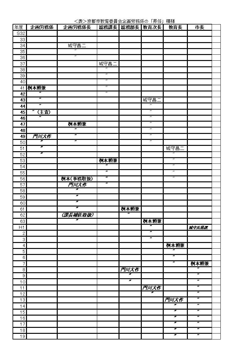 1 京都市の教育行政の特徴と企画労務係の位置 かつて1967年の富井市政誕生からしばらく「革新市政」と呼ばれる時代があった。その10年ほどの間に、組合敵視の人事の解消、「学テ事件」などの不当免職処分の撤回、学習権保障の観点の明示、教科書採択の民主化などの前進が京都市の教育行政にもみられた。「しかし一方、保守市政下の教育行政の残滓を払拭しきれていない 」面も多くあった。同和教育行政や障害児教育行政とその人事行政に公正・民主・科学性の原則が貫かれないことや議会を気にしすぎて教育理念にもとづく自律的教育行政運営が弱いこと、幹部職員のみでの企画政策決定や企画労務係中心の非民主的運営が払拭できていないこと、教育要求運動や教組活動に対する敵視意識が残る事務局の官僚主義的傾向、などである(室井 修「京都市教育行政の到達点と課題」(京都教育センター『教育を国民の手で』第2号、1978年)。 1975年船橋市政2期目からは各党「相乗り」となり、「革新市政」が変質し、保守市政に回帰する。労務対策的教育行政は、校長協力者とそうでない者の氏名を挙げて教委に報告する秘密調査(「学校状況調査」)の発覚(1982年)、市教組・京教組の分裂、破壊(連合日教組京都支部づくり)を日教組役員らと謀議した「岡山・山佐本陣事件」(1989年2月)、「"校長道というのは、死ぬことと見つけたり"の気構えで事にあたってほしい」とする「全市学校校園長研修会」での教育長訓辞(1989年)、採用や人事とも関連する思想調査まがいの"講師評価表"を校長に出させる(1992年)など、時にスキャンダラスな面を見せつつ、その度を強めていった。 最近でも内閣府主催「文化力タウンミーテイング・イン・京都」(2005年)における一部市民の意図的排除など、「敵視意識」と従来の手法が露呈することもある。また日常的には、履歴事項として賞罰欄に記載する校長の内申にもとづく教員表彰制度(2002年から)や目標管理による「教員評価制度」(2006年度から本格実施)などの手法で、巧妙に教職員管理が強めてられている。 こうした教育行政の中軸が、1956年に全国で初めて設置された「企画労務係」(職務は、特命による調査・企画・立案、市議会関係事務、報道機関との連絡調整、職員団体及び労働組合関係対策など)である。この企画労務係は今も総務部総務課にあり、「特命による調査・企画及び立案、報道機関との連絡調整、陳情・職員団体及び労働組合に関すること、市会との連絡」などを担当する。そして「中枢的職務内容をもつ企画労務係が事務局職員の出世の登竜門となり、労務対策で辣腕をふるったものが事務局幹部へと昇任していった」(室井:同上)という仕組みは今日も変わらない(「表」参照)。
