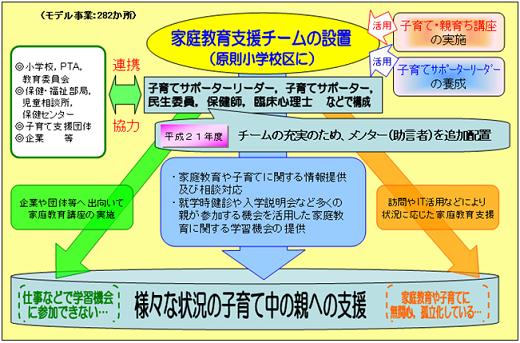 例えば、「家庭教育基盤形成事業」を見ると図のように、民生委員、保健師、臨床心理士などと並んで、地域のボランティアに人材を求めるものとなっており、「放課後子どもプラン」など先行する事業などの間で、人材確保や事業展開をめぐって、整理が必要な状況も生まれてくるのではないかと思われる。「家庭基盤形成事業」の事例を見ると、「家庭教育支援チーム」に、子育て支援関係団体やNPO関係者などが上げられており、各地でそれぞれのニーズと要求に基づいて多様に展開されている子育て支援のサークル・グループの活動との間に、接点や重なりが生まれてくることが予想される。 子育て支援のネットワークは、自主的・自発的活動のグループ内のメンバー同士、そしてグループ間の協同と緩やかな組織づくりとして発展してきており、政策的に、いわば上からの組織づくりとは馴染みにくい。もとより、子育てに関わるニーズや、関係のあり方は多様であり、多様性を尊重することが、子育て世代全体のちからを引き出す上でも有効と思われるので、事業化にあたる市町村では、既存グループの活動状況をていねいにつかみ、そのエネルギーを引き出すことにちからを注ぐことが必要である。 これからの子育て支援ネットワークを考える −−ネットワークと地域づくり このように、少子化や青少年の健全育成をめぐって、地域住民の組織化を図り、新たな事業を展開していこうとする動きが広がるなかで、これまで親たちや住民の有志によって生み出され、育てられてきた子どもや子育てに関わる、各種のボランティアグループ、サークルなどは、これからに向けてどのような発展の道筋を考えていけばよいのであろうか。 学童保育が運動の長い歴史を経て、法にもとづく制度となり、更なる充実を求める段階へと進んでいるように、親たちの子育て支援の取り組みや、子どもの自立への居場所づくりに取りくんでいるフリースクールの活動なども、その必要性が広く社会的に認知され、公的な制度として確立されていくことが期待される。 その際に重要なのが、既に触れたように、政策的に"上から"作られようとする施策・事業とボランティアグループやNPOなどによって生み出され発展してきている協同の取り組みとの関係である。さらに、子育て、介護、環境保全、まちづくりなどの分野ごとに展開・蓄積されてきている活動相互の関係づくりの課題がある。 子育て支援のネットワークは、子育て中の親、保育士、教員、児童福祉職員、保健師、民生児童委員など、子育てに関わる多様な主体をつなぐことと同時に、他の分野の専門家、ボランタリーな活動の担い手との間にも、連携・協同の関係を築いていくことによって、身近な地域を、教育や福祉、さらには産業や文化をつくっていく力のある共同体に育てていくという展望を持つことで、自らのネットワークそのものを一層確かなものとすることができる。そこで、ネットワークづくりをより広く地域づくりの視点から見ておくことが必要となる。 −−新たな地域づくりとネットワーク 新たな地域づくりというときの、新しさは、市場経済や競争的関係の一般化によって崩されてきた、暮らしの共同体としての地域の機能を、住民の命と暮らしに関わる権利の保障を原理として、あらためて連帯と協同の関係を結びなおしていく新しさであり、ネットワークは、 上意下達のピラミッド型組織ではなく、それぞれの独自性・創意工夫を大事にしながら、情報やノウハウの共有によって、それぞれの活動の発展を図るべく、組織・グループが、対等な関係で横に繋がるところに核心がある。また、横につながると同時に、交流が活発に進むためには、調整(コーディネート)の役割も大切で、事務局の運営やリーダーの育成には、専門的な知識・技術も必要で、社会教育や社会福祉の職員などが、活動を支援する仕組みも重要である。 最近の自治体経営の流れの中で、住民の暮らしにかかわる事業で、予算・人員の面で縮小・削減が見られ、住民の自発的・自主的活動を支え、育てる条件が弱まる傾向が見られるが、住民が地域課題・生活課題を解決していくための力をつけていくことは、長期的に見たとき、経営的メリットもあり、自治体には短期的に安易な縮小・削減を進めない慎重さを求めたい。 −−地縁組織とNPO 全国どの地域にも町内会(自治会)、子ども会、体育(スポーツ)振興会、青年団、婦人会(女性会)、PTA、消防団など、小学校区や町単位で組織された様々な地縁組織がある。それぞれの活動には、担い手や活動スタイルなどの面で、悩みや課題も多く、中には、地域によって活動が休止していたり、組織そのものが解散してしまっているケースも見受けられる。一方で、課題や要求によって組織されるグループ、それが事業体として発展したものとしてのNPO組織が、今日ではたくさん生まれてきている。それぞれのグループの活動の中では、住民