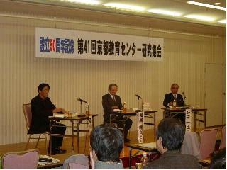 設立50周年を迎えた京都教育センターは、さる12月25日(土)・26日(日)に第41回研究集会を開催しました。第一日目全体会の記念鼎談として、堀尾輝久さんと野中一也さんに「戦後教育を検証し、今日の教育課題を語る」と題して、戦後65年に渡る日本の教育を振り返りながら、「新しい教育」の模索についても縦横に語って戴きました。その要旨を紹介します。 はじめにコーディネーターの築山さんが「戦後65年を経て、どういう地平に立っているのか、またどういう方向に向かうのか、お二人の話をお願いしたい」と切り出し始まりました。 堀尾さんは、1945年から臨教審にいたる時期について「世界史的に見ても、1945年は、大きな流れの中の出来事。無差別爆撃・核攻撃が当たり前の時代が終わって、平和をつくらねばならない、そうした大きな流れの中で、戦後の政治改革がある。私は地球時代の入り口と見ている。教育基本法の理念も提起されたが、まだ実現されていない未完のプロジェクトである。1950年代〜60代は「国家の復権」の時代。そういう時代を通して、憲法・教育基本法の意味を自覚する。ベトナム戦争などを通して、憲法の理念が深く理解されるようになる。社会は高度経済成長で、能力主義が万延してくる。しかしまだ“開かれた競争”の時代であった。80年代以降は、“開かれた競争から閉じた競争へ”。そういう時代に、子どもの権利を軸とした国民教育権論が転換された」。また野中さんは「今、話のあった時代を、足元の地域からどのように作り上げていくのかを問題していきたい。個の中に、大事なものがいっぱいある。国民教育の国民はその地域に住んでいる住民、それを大事にしたのが旭丘の教育であった。京都では、弾圧の中で、父母と手を結び、研究者と手を結んで実践をしていった。細野武男は“国民教育について”の講演で、科学的認識・全面発達・集団主義の3つの原則を提起した。彼は精神的強さ、内面の強さについて楽観的であった。そうした中で革新的な首長を生み出した。蜷川さんはロマンティスト。“15の春は泣かせない”“知事は樽御輿”など名言も多い。私たち自身が民主的力量をつけて、こんな社会をつくりたいとしてつくっていく。蜷川さんは“道はただひとつ、この道をゆく春”といっている。」 話は、このあと新自由主義教育への対抗軸、新しい教育への展望へと続き、約2時間に渡る充実した話し合いとなりました。 なおこの鼎談の詳細については、「京都教育センター年報 第23号」(2011.3.5発刊予定に掲載する予定です。