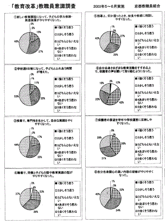○八幡の教育委員会のアンケート。小学校一年生に,挨拶や先生の対応等を聞いている。高学年 には、「成績はどうだったか」「先生は、○○○してくれるか」と言うアンケートがあって、 それを学校を通じてやらせていく。1学期は、父母へのアンケートであった。これを押し返し て、どういう教育実践をつくっていくのか,が問われている。